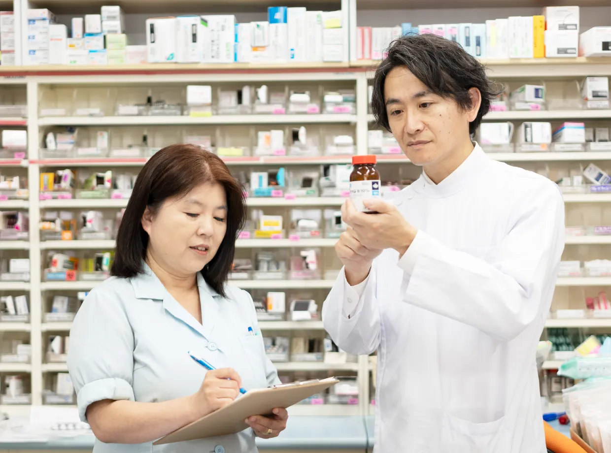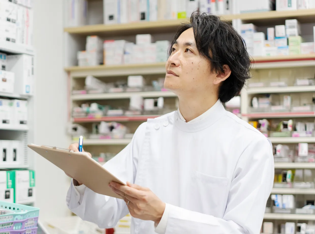 薬剤師としては、クリニックからの外来患者さんへの対応が主な業務です。またエリアマネージャーという役職にも就いています。各店舗の売り上げと人件費とのバランスを見極めながら削れる部分を削り、少しでもプラスになるよう店舗に指示したり、一緒にお話ししながら相談したりしています。現在は1店舗でメインに働きつつ、3店舗を見ていて、ほかの店舗にも合間を見てうかがっています。