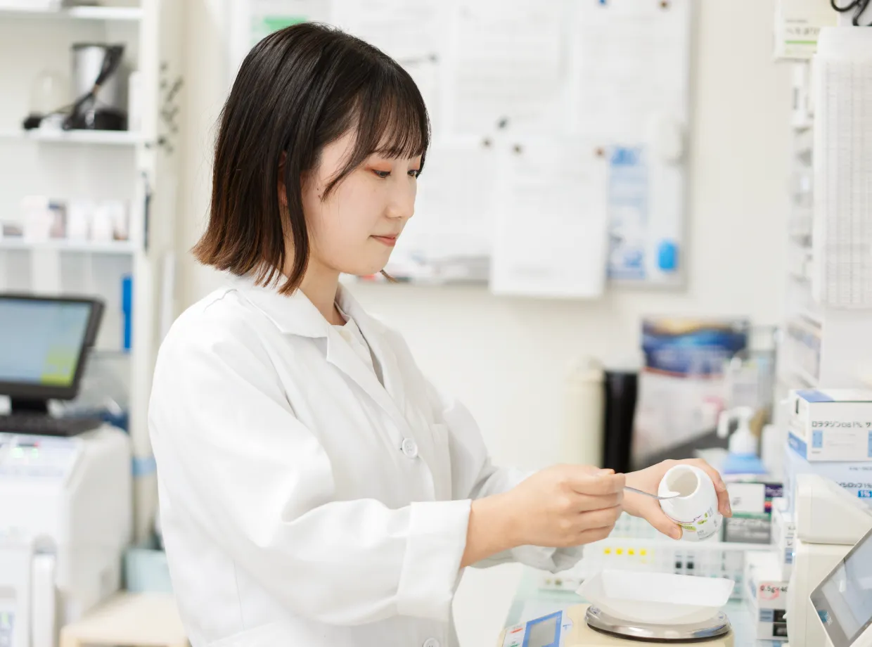 今年、入社2年目で今は基本的に隣の病院さんの処方を受け付けしており、小児科と内科がメインです。他にも、施設の処方にも対応していて、認知症、慢性疾患の患者さんの処方も調剤しています。